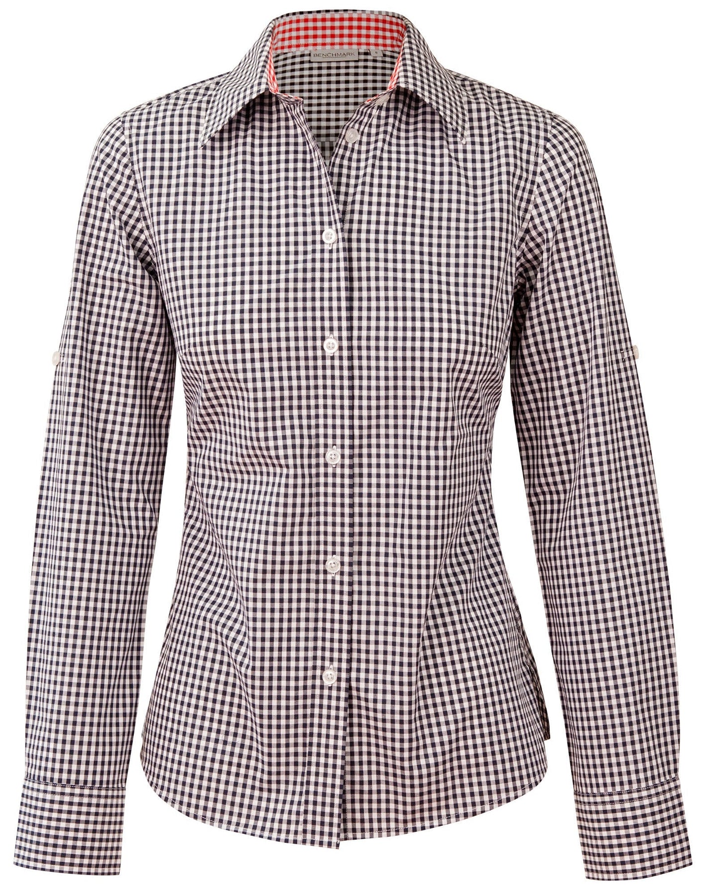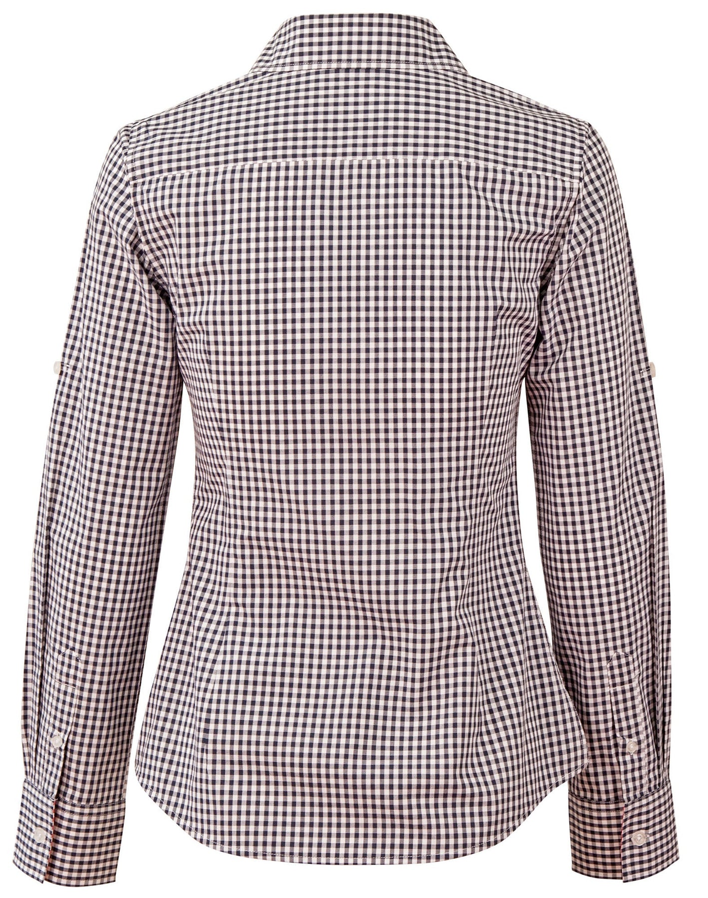 Fabric 60% Cotton 40% Polyester, Yarn Dyed Gingham Check Styling Roll up sleeve tab, pearl buttons, contrast fabric at inside collar stand and inside cuff
