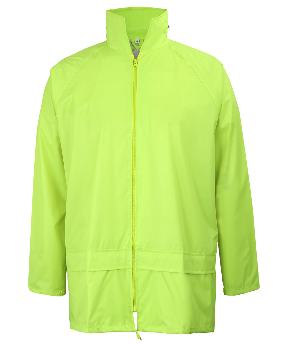 Classic fit 100% polyester 170T with PVC coating, 190gsm Waterproof rating 2000mm Fully seam sealed Jacket: Back yoke with concealed mesh for breathability, Concealed hood, Two front pockets; Sleeve opening with plastic snap button, drawstring at hem for adjustability Packed into PVC bag with zip closure