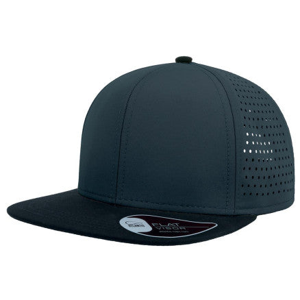 100% Polyester Microfibre fabric with Chino Cotton Twill under peak|Fabric weight - 90 g/m2|High shape structured 6 panel cap with flat squared peak|Adjustable PVC snap closure|Black peak with 4 stitch lines|Unique laser cut holes in side panels